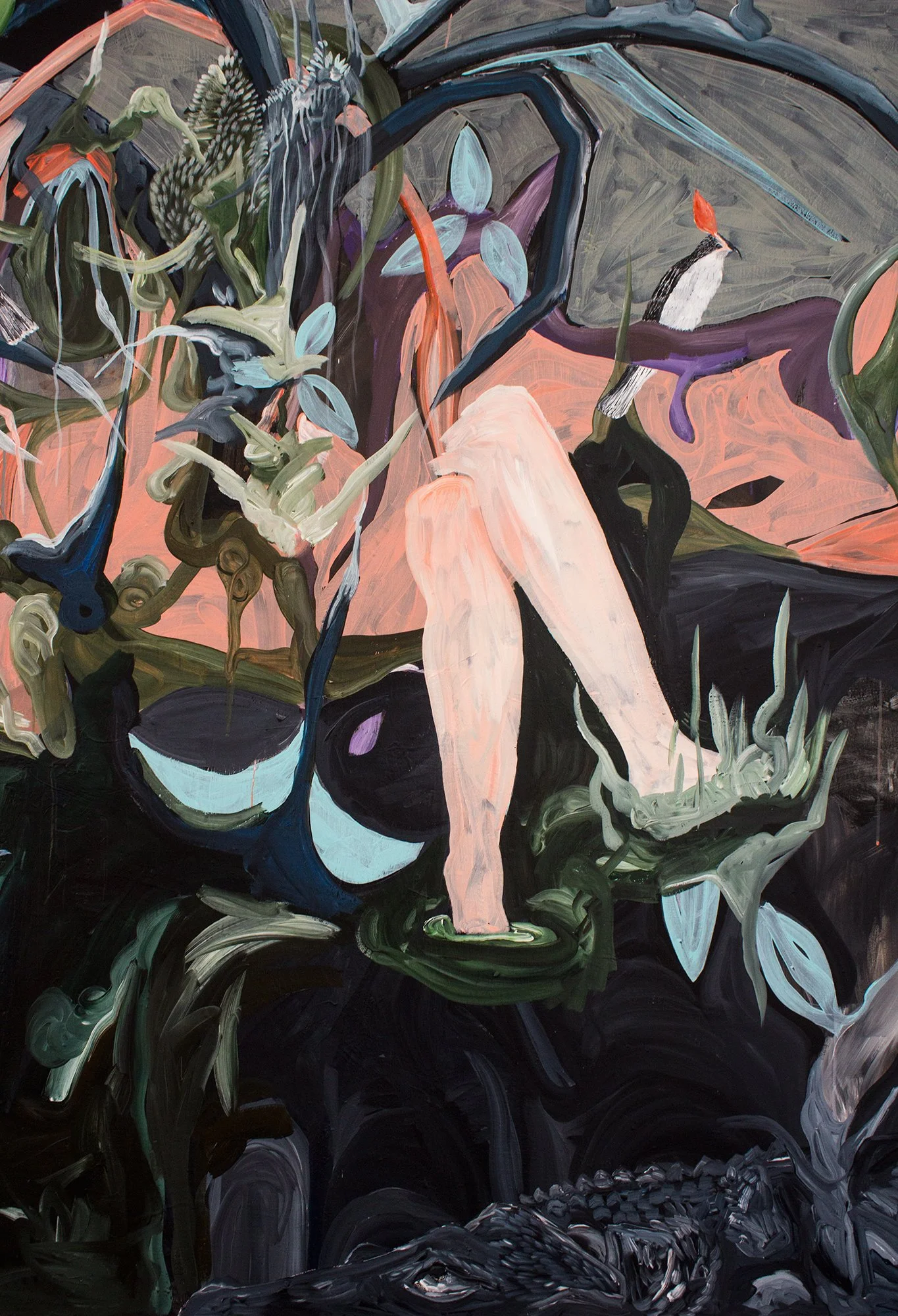 Mia-Nelle Drøschler’s residency at The Danish Cultural Institute in Rome 2016 bore witness to a remarkable and spontaneous creation. Inspired by her extensive research into site-specific religious paintings gracing the city’s numerous churches, she embarked on a direct response to this rich artistic heritage. The result was a mural that vividly portrayed a natural, organic world where a woman appeared to float amidst exotic birds, all within the framework of apparent chaos that somehow found its own equilibrium. This figurative impossessed a powerful abstract quality, blurring the lines between representation and abstraction.